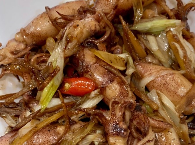 - 小卷快閃! 看到油開始有點冒煙了,立刻把瀝乾的小卷倒進去!嘩啦一聲,鑊氣就來了!大火快速翻炒,看到小卷身體捲曲起來,邊緣有點金黃焦香,大概7-8分熟就馬上先盛出來。千萬別炒老!老了就像橡皮筋,毀了一鍋好料。(我的血淚教訓:多猶豫10秒就老了!)