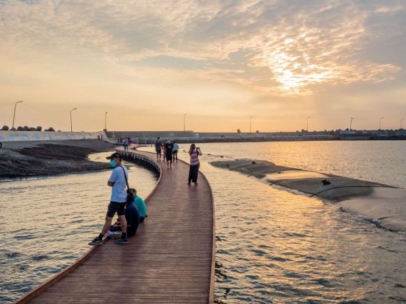 2. 海岸光廊散步吹風賞夕陽: 強烈推薦!傍晚時分,沿著木棧道散步,看看那些利用漂流木和蚵殼創作的藝術品(像巨大螃蟹、魚群之類的),吹著帶點鹹味的涼爽海風。這裡的夕陽真的超美,天空和海面染成一片橘紅,搭配漁船剪影,手機隨便拍都是明信片等級。情侶來很浪漫,家庭帶小孩來跑跑也很適合。