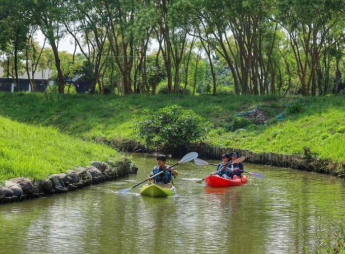 • 🚶 浪漫運河與吊橋散步趣: 園區規劃了環埤塘步道,沿著運河水道修建,兩旁綠意盎然。我最愛其中幾座荷蘭式吊橋(像是紅色的那座),走起來微微搖晃,很有趣味。站在橋上欣賞水道兩邊的綠樹、小屋倒影,微風吹來,真的很療癒。步道平緩好走,帶長輩或推嬰兒車都沒問題。